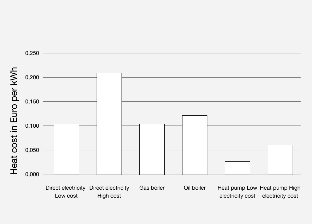 The electrical energy to drive this process compared to the heating energy that is given to the house has a seasonal factor of about 3. This means that if you use 15,000 kWh for heating and domestic hot water after installation you only need about 5000 kWh. The exact saving depends on the climate and whether you have a low, medium or high temperature heating system. Let us make a calculation based on your house and needs.